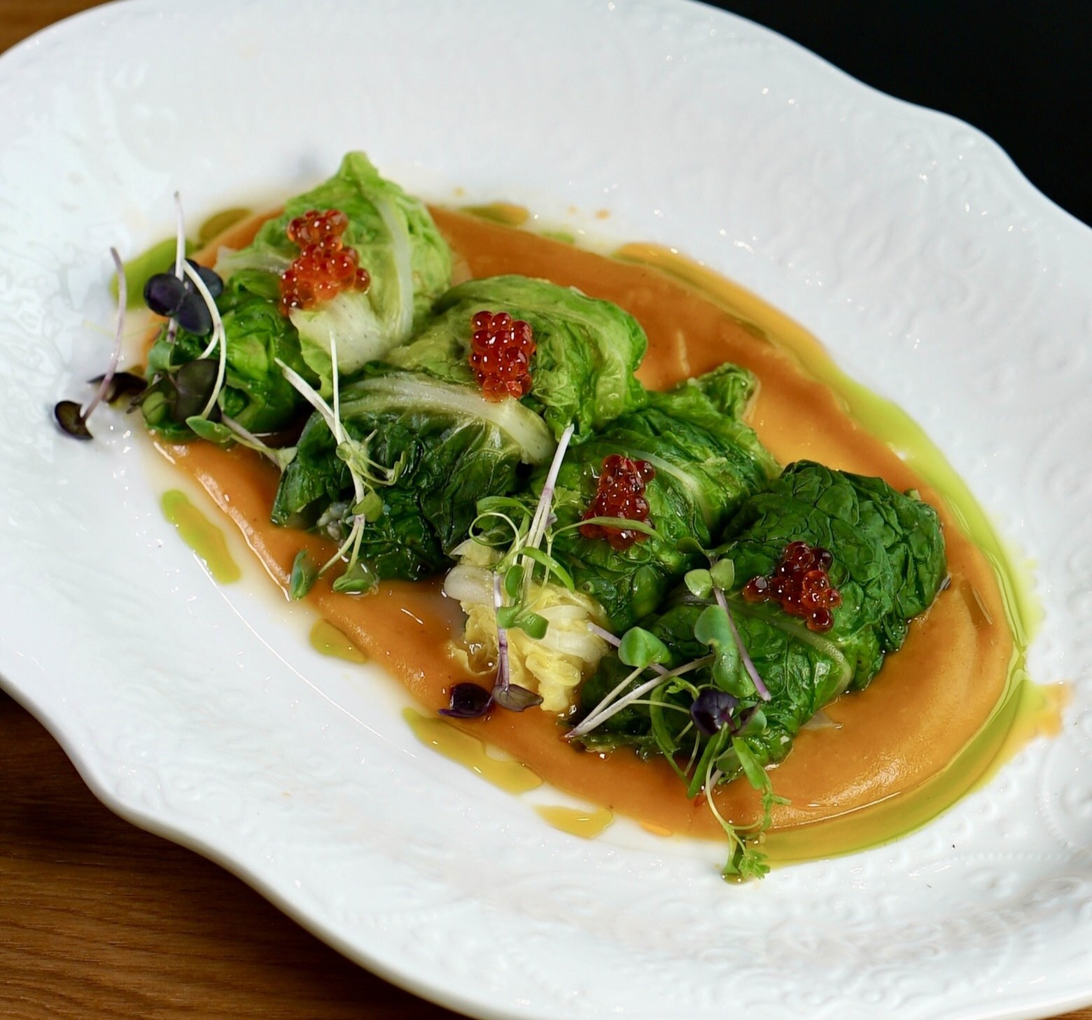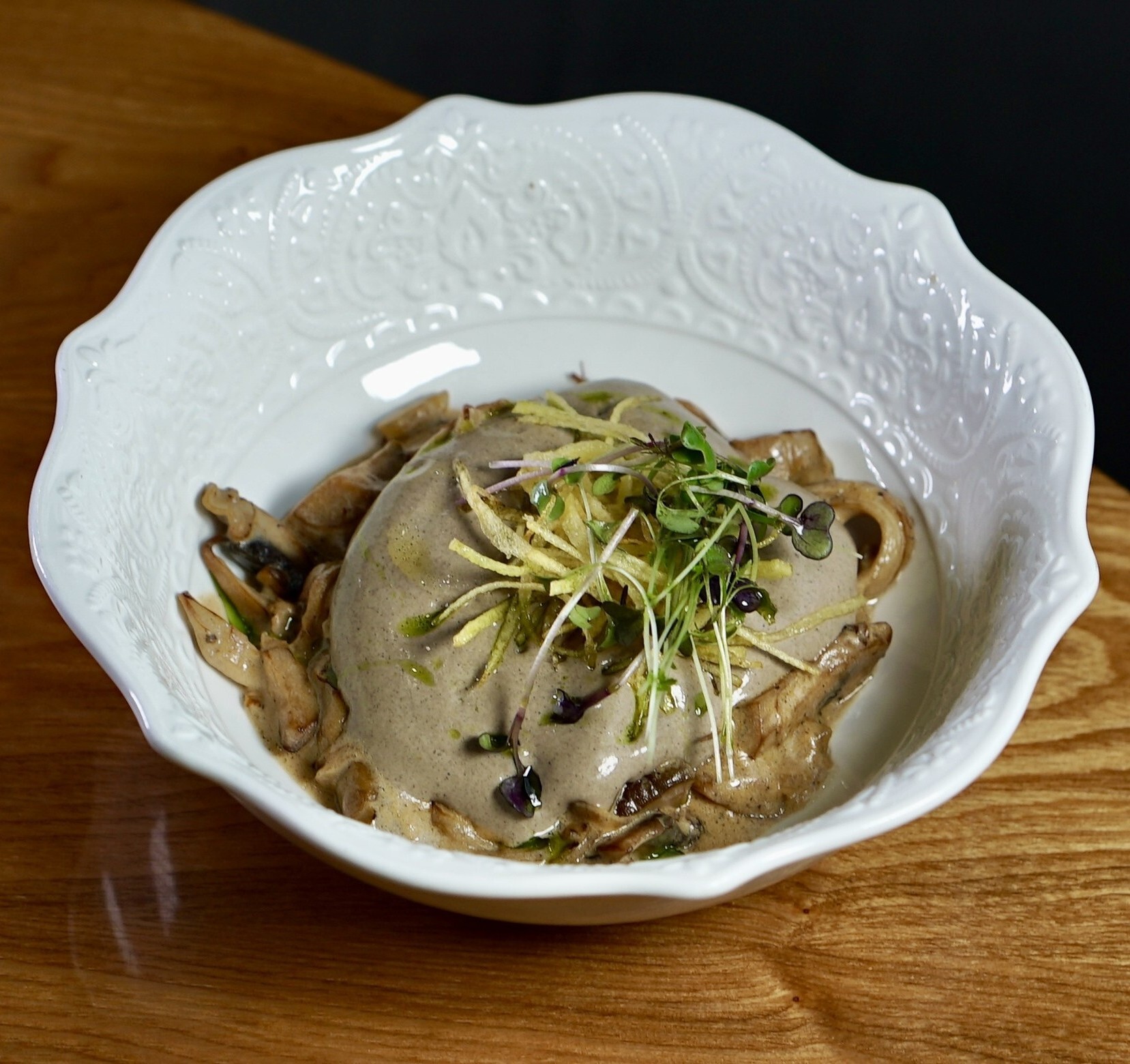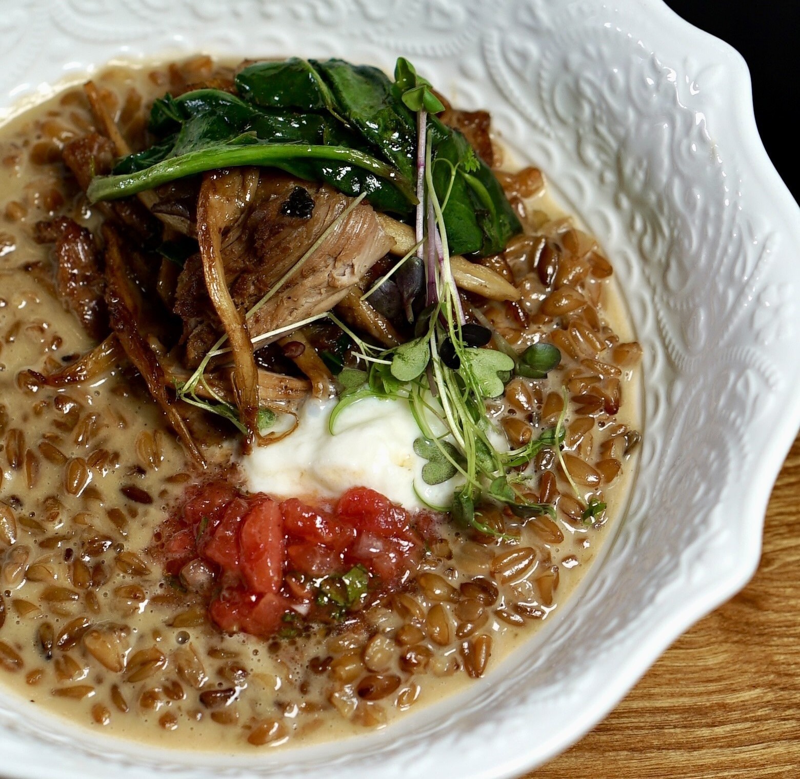 орехово-сливочное ризотто с пряной уткой, грибами и томатами